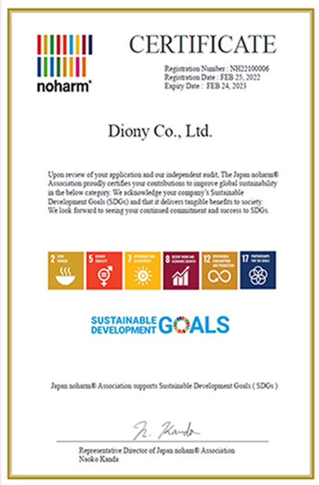 ディオニー株式会社は、地球環境と人々の健康に配慮した商品・サービス・社会活動を通じ、
