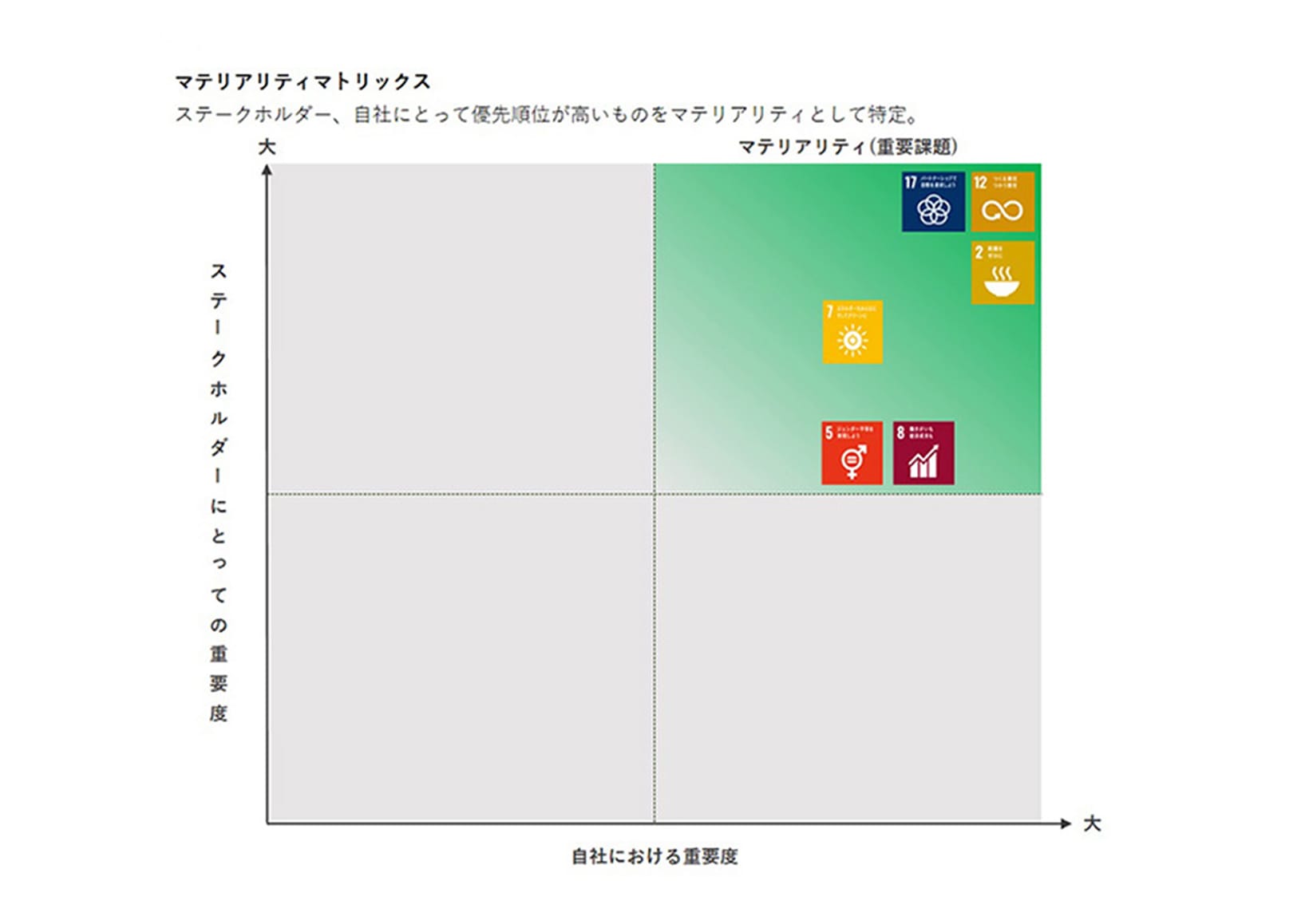 「SDG Compass」をガイドラインとして5つのステップの中で、ロジックモデルによる分析(バリューチェーンマッピング、マテリアリティマトリックス作成)により、当社として優先すべきSDGsのゴールとターゲットを特定しております。
